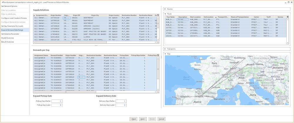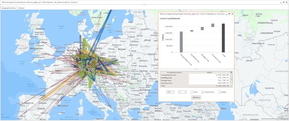 Com base em requisitos passados e futuros, o software planeja estruturas e conceitos de transporte ideais. Determina os custos de transporte usando os valores relevantes cobrados por cada operador logístico. Restrições de frequência mínima ou objetivos conflitantes, como estoques ou custos de contêiner versus custos de transporte, são levados em consideração nesse processo. O software também considera conceitos de eficiência de custo, como o agrupamento de remessas entre os locais, e mostra sinergias.